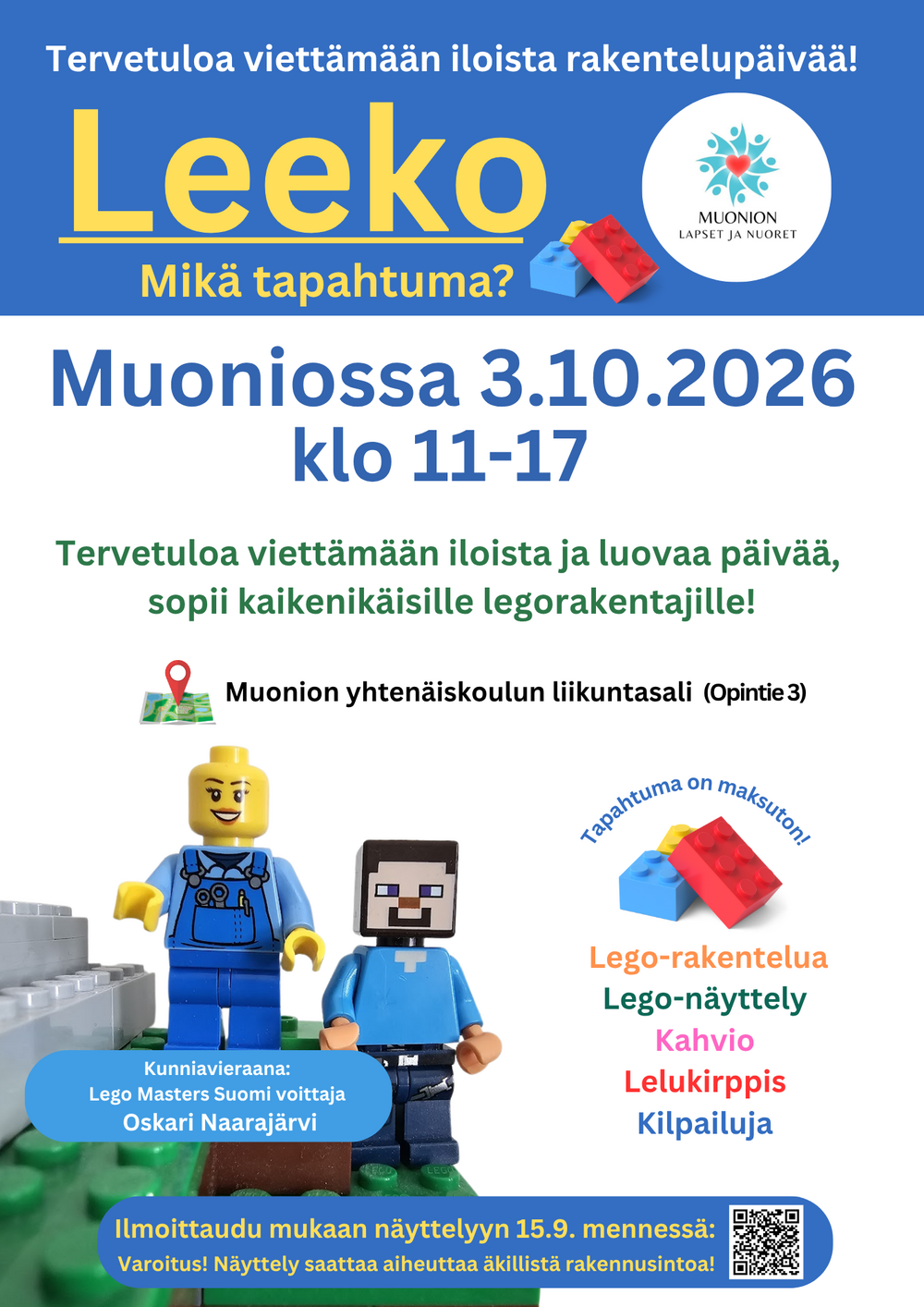 Tapahtumassa: lego-rakentelua, kahvio, lelukirppis, kilpailuja ja lego-näyttely. Iskikö rakentelukipinä, tuo omasi näytteille! Näyttelyyn ilmoittautuminen alla olevalla ilmoittautumislomakkeella.